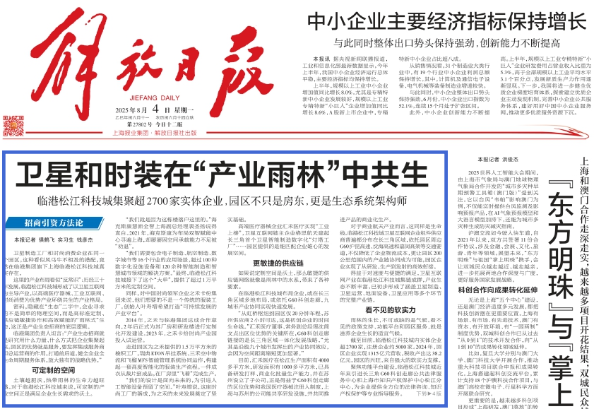 《解放日报》头版:临港松江科技城《卫星和时装在“产业雨林”中共生》