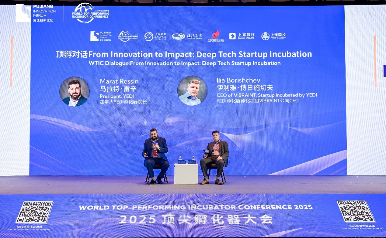 开幕式现场,加拿大YEDI孵化器院长马拉特·雷辛博士和优质孵化项目VIBRAINT公司CEO 伊利雅·博日施切夫进行了一场“顶孵对话”,分享了全球顶尖孵化器创新孵化的生动案例。